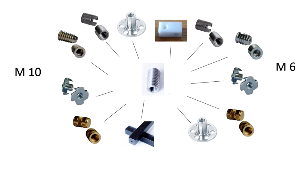 - Applicable to objects of wood, plastics, metal, composites, with threaded inserts or tapped fixing points
